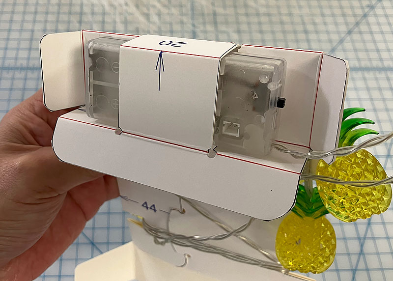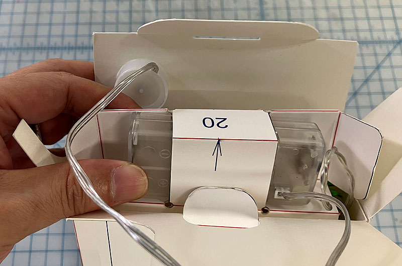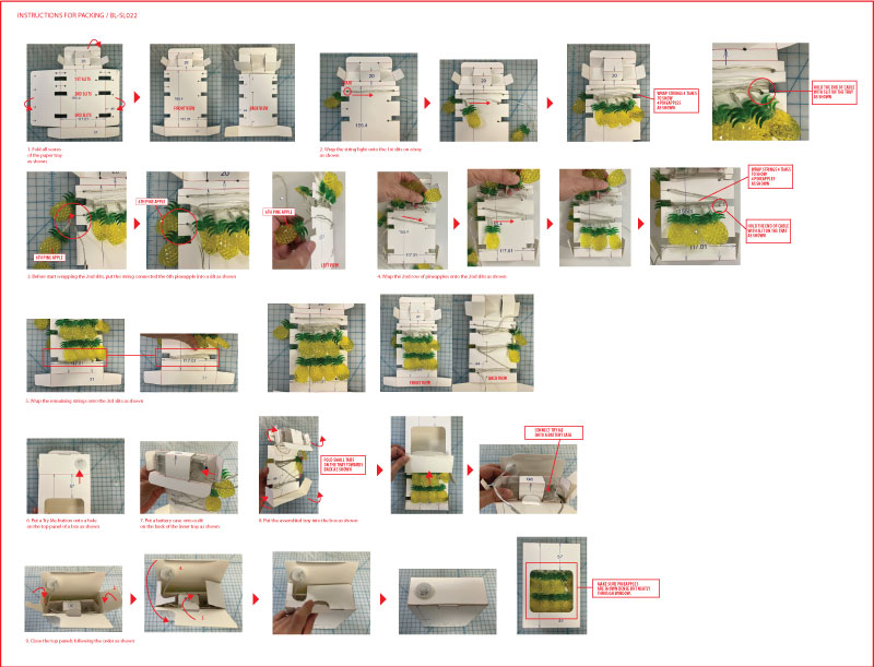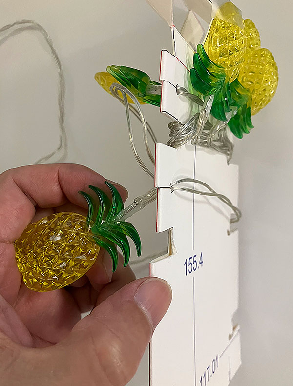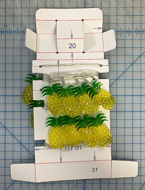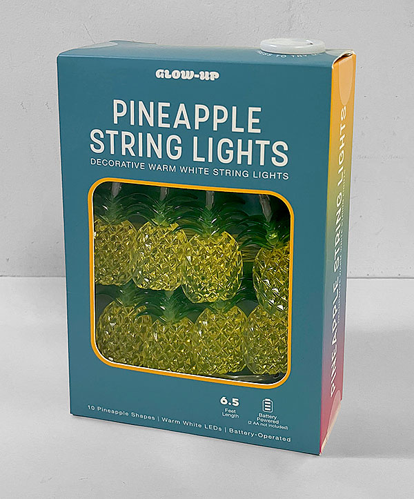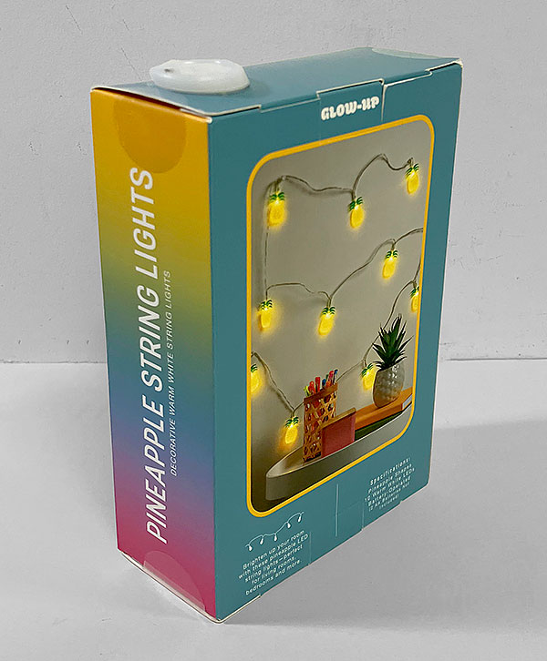 This is a package for string lights from the home decor brand Grow-up, sold by the discount store Big Lots. The package includes a Try-me button, allowing consumers to see how the lights illuminate in-store. Additionally, there is a window on the front of the box to showcase the product. To display the string lights in an organized manner, they are wrapped in an inner tray.