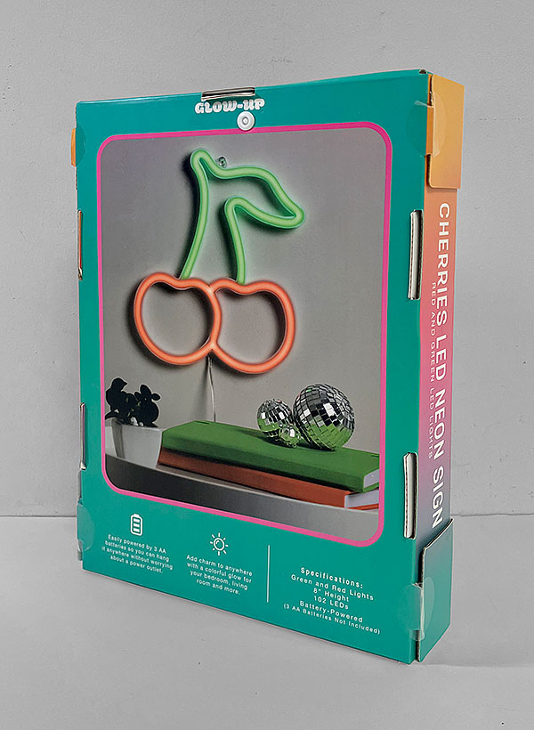 This is a package for the home decor brand Grow-up by the discount store Big Lots. The package has been designed for their wall neon light. The package includes a Try-me button so that consumers can see how the light illuminates in-store. To showcase the product, an open box (rollover) style packaging structure is used.